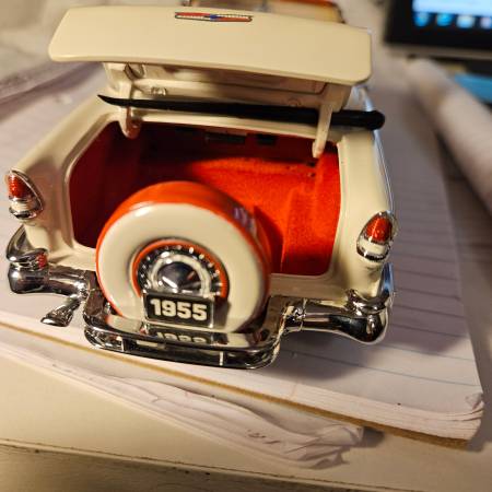 We have a Franklin Mint 1955 Chevrolet Belair Convertible Red/ White heavy metal diecast Car scale 1/24. It comes with box and paperwork. It has operational Steering, hood, Doors, And trunk lid. It has highly detailed Interior, Exterior, Engine and under carriage. It looks fantastic. It even has tha Continental Tire/ Bumber Kit