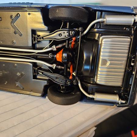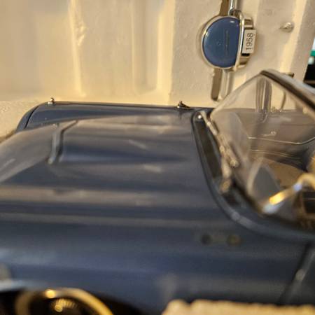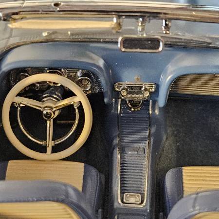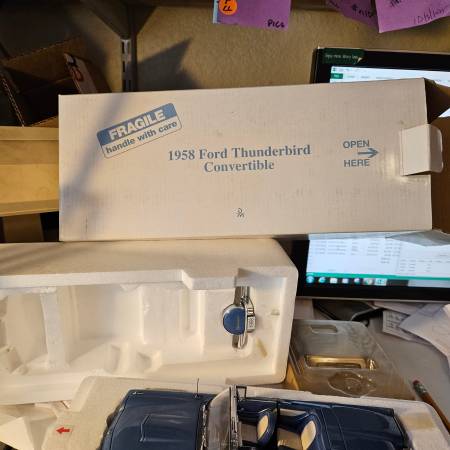 We have a Danbury Mint 1958 Ford Thunderbird Convertible Blue with removable white top. It comes with a Regular Bumper and Has A removable Continental kit bumper as well. The car has operational steering, doors hood, Trunk Lid. The car has highly detailed exterior , interior, under carriage, and engine compartment. The car antenae is retractable. The car displays well. There are a few issues which have reduced the price to $70. The mirror and a trim piece are detached and included. The spare tire and deck lid thunderbird chrome are missing, (see photos).