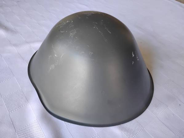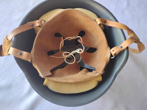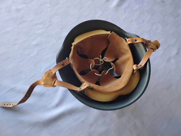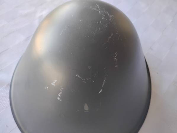 It is in excellent condition, including the liner and chin strap. There are some minor scuffs around the top of the helmet, visible in the pictures.