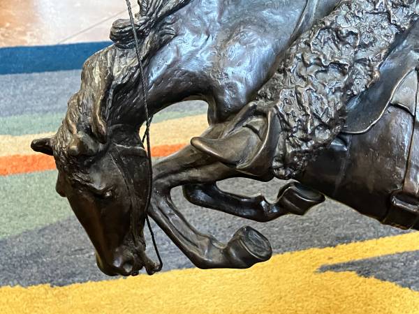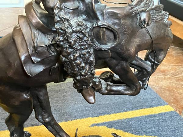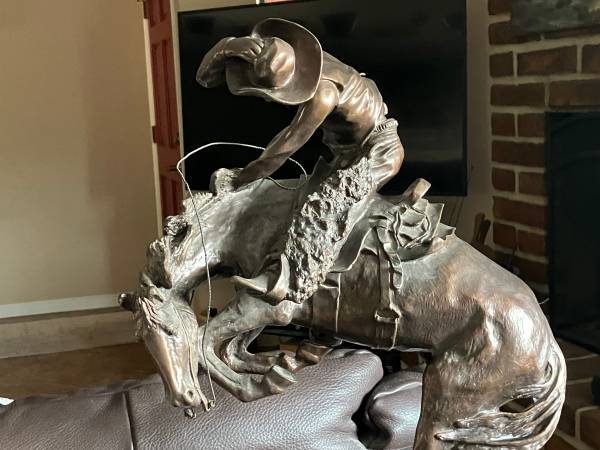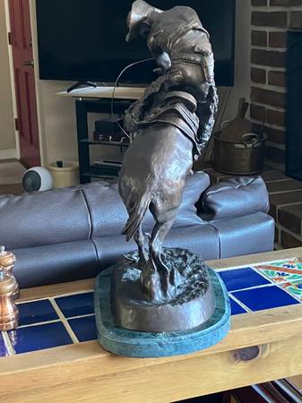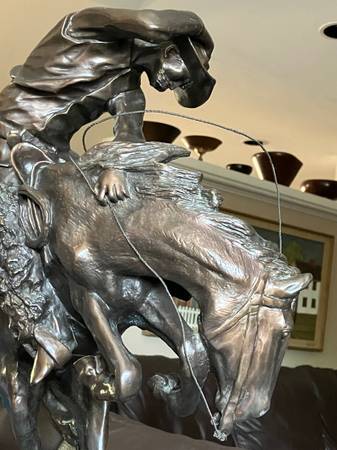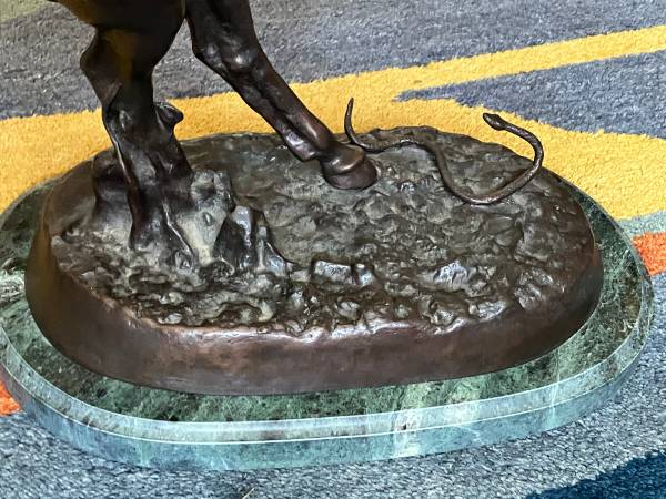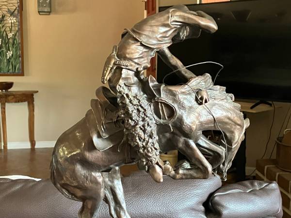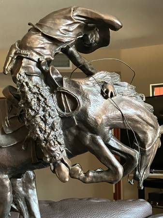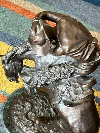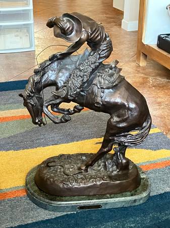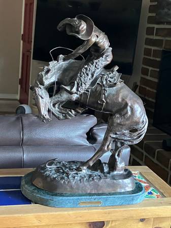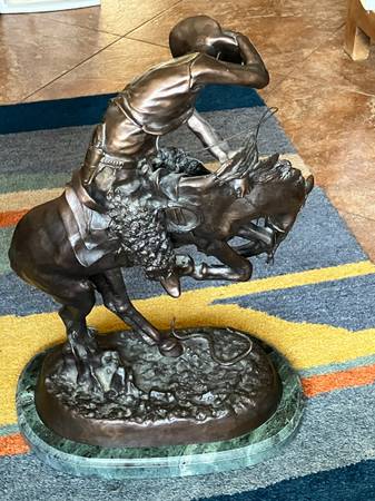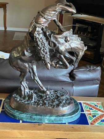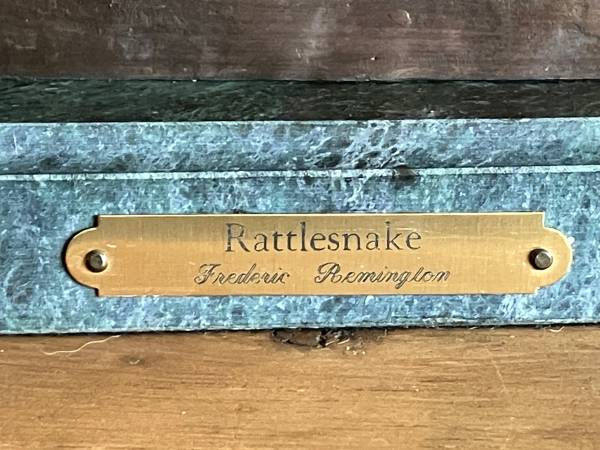 This is Frederic Remington's ''Rattlesnake" titled Bronze Statue on Marble. 22.5" tall. The oval marble base measures 16" x 10" x 1 1/4''. Weighs 62.55 lbs. Aside from a little dust in the nooks here or there, it's in "as new'' condition with no shortcomings. Call Ron and leave message or text.