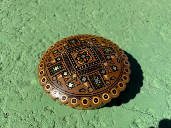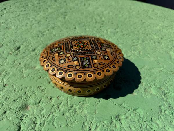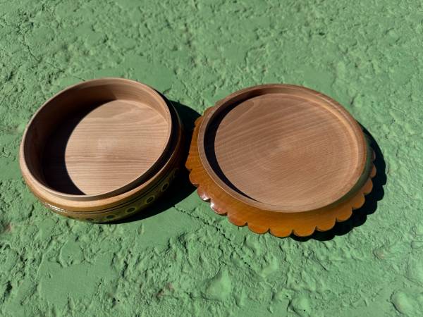 Ukrainian Hutsul Rakhva wooden box. $37. Nice shape. The lid is 7 inches round. The bottom is 6 inches round. Total height is 3 inches. ><> All offers will be considered. We are located at...