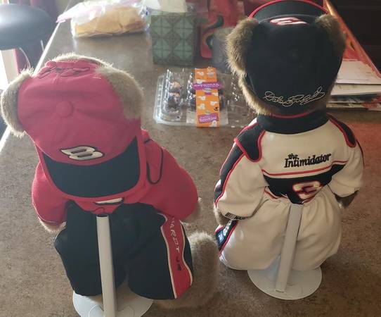 VINTAGE NASCAR #3 DALE EARNHARDT SR. & #8 DALE JR. UNIFORM BOYDS BEARS W/TAGS AND HATS. USED FOR DISPLAY PURPOSES ONLY. SMOKE AND PET FREE HOME. INCLUDES STANDS.