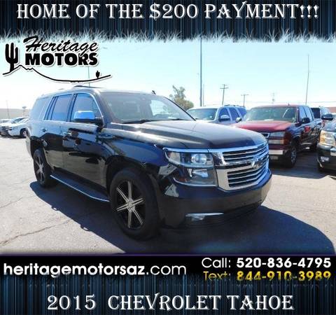 Experience premium comfort and power with this 2015 Chevy Tahoe LTZ, now available at Heritage Motors in Casa Grande. This full-size SUV delivers everything you want in a family vehicle strong V8 performance, refined luxury, and plenty of space for passengers and cargo. With its bold exterior design, upscale interior, and advanced features, the Tahoe LTZ is built to impress on every drive.Highlights:5.3L V8 engine with smooth and reliable powerLeather interior with heated and cooled seatsPremium Bose sound system and touchscreen display3rd-row seating for up to 7 passengersPower liftgate, backup camera, and navigationClean, well-maintained, and ready to driveAt Heritage Motors, we believe everyone deserves a quality vehicle regardless of credit history. With our Buy Here Pay Here financing, we make it simple to get approved and on the road today.Stop by 1531 N. Pinal Ave, Casa Grande, AZ 85122, or call 520-836-4795 for more information or to schedule a test drive.Heritage Motors Where we finance any credit and put you behind the wheel.Heritage Motors is family owned and operated! We are a BUY HERE PAY HERE and have been in business for over 20 years!! Heritage Motors is now reporting credit through Equifax!! Come grow your credit with us!! Largest inventory is Central ARIZONA and Tri-Valley Area!! Heritage Motors is located in Arizona the home of cactus jack rabbits, and dry heat. Come in and let us work our magic auto sales for you to get the best auto deals possible, and Drive Now. Its Drive time! Let's get you into a premier auto for you and your family, and take auto action now!!! We cover all of AZ from Tucson to Flagstaff, Yuma to Show Low, Maricopa to Globe, Phoenix to Sierra Vista! Come see why we are the best in the business!!! If you have a question about a vehicle and you don't see the answer here give us a call at 520-836-4795! We are ready and willing to help you find the perfect car for you! We have the largest inventory in central Arizona so if you don't see it here call us and see if we have it at another lot or if its coming soon!