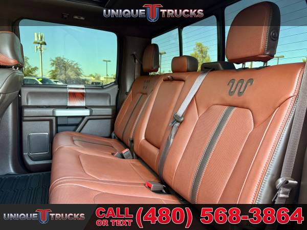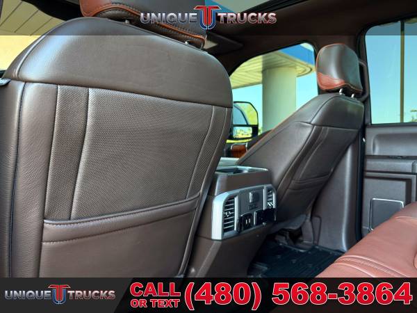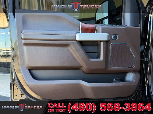 INSTALLED FEATURES: Air filtration, Front air conditioning: automatic climate control, Front air conditioning zones: dual, Rear vents: second row, Airbag deactivation: passenger switch, Front airbags: dual, Side airbags: front, Side curtain airbags: front / rear, Antenna type: diversity / mast, Auxiliary audio input: Bluetooth / iPod/iPhone / jack / USB, Digital sound processing, In-Dash CD: MP3 Playback / single disc, Premium brand: Sony, Radio: AM/FM / HD radio / touch screen display / voice operated, Radio data system, Satellite radio: SiriusXM, Speed sensitive volume control, Subwoofer: 1, Total speakers: 9, Watts: 700, ABS: 4-wheel, Braking assist, Electronic brakeforce distribution, Front brake type: ventilated disc, Power brakes, Rear brake type: ventilated disc, Armrests: rear center with cupholders, Center console trim: leather, Door sill trim: scuff plate, Door trim: leather / wood, Floor mat material: carpet, Floor material: carpet, Floor mats: front / rear, Heated steering wheel, Steering wheel trim: leather, Adjustable pedals: power, Ambient lighting, Assist handle: front / rear, Center console: front console with armrest and storage, Cruise control, Cupholders: front / rear, Easy entry: power driver seat, Keypad entry, Memorized settings: 3 driver / adjustable pedals / driver seat / side mirrors / steering wheel, Multi-function remote: panic alarm / proximity entry system, One-touch windows: 2, Overhead console: front, Power outlet(s): 115V front / 115V rear / 12V front, Power steering, Power windows: lockout button, Push-button start, Reading lights: front / rear, Rearview mirror: auto-dimming, Remote engine start, Steering wheel: power tilt and telescopic, Steering wheel mounted controls: audio / cruise control / multi-function / phone / voice control, Storage: accessory hook / door pockets / front seatback / under rear seats, Universal remote transmitter: garage door opener, Vanity mirrors: dual illuminating, Door handle color: body-color, Fender lip moldings: accent, Front bumper color: accent, Grille color: chrome, License plate bracket: front, Mirror color: body-color, Paint: two-tone, Pickup bed light: LED, Rear bumper color: accent, Running board color: accent, Running boards: illuminated, Tailgate: lift assist / power locking / power open / removable, Window trim: black, Connected in-car apps: app marketplace integration / Google POIs / Google search / SiriusXM Travel Link / SYNC Destinations-travel, Infotainment: SYNC, Infotainment screen size: 8 in., Smartphone integration: Android Auto / Apple CarPlay, Clock, Compass, Customizable instrument cluster, Digital odometer, External temperature display, Fuel economy display: MPG / range, Gauge: oil pressure / tachometer / transmission temperature, Instrument cluster screen size: 8 in., Multi-function display, Powertrain hour meter, Trip odometer, Warnings and reminders: low fuel level / maintenance due, Exterior entry lights: approach lamps / puddle lamps, Front fog lights, Headlights: auto delay off / auto high beam dimmer / auto on/off / halogen / quad headlights / wiper activated, Side mirror adjustments: power / power folding / power telescoping, Side mirrors: heated / integrated turn signals, Towing mirrors, 4WD selector: electronic hi-lo, 4WD type: part time, Alternator: 200 amps, Battery: maintenance-free, Battery rating: 750 CCA, Battery saver, Automatic hazard warning lights, Camera system: rearview, Child safety door locks, Child seat anchors: LATCH system, Crumple zones: front, Impact sensor: alert system / door unlock / post-collision safety system, Parking sensors: rear, Programmable safety key, Rearview monitor: in dash, Emergency locking retractors: front / rear, Front seatbelts: 3-point, Rear seatbelts: 3-point, Seatbelt pretensioners: front, Seatbelt warning sensor: front, Driver seat: cooled / heated, Driver seat power adjustments: 10 / height / lumbar / reclining, Front headrests: 2 / adjustable, Front seat type: captains chairs, Passenger seat: cooled / heated, Passenger seat power adjustments: 10 / height / lumbar / reclining, Rear headrests: 3 / adjustable, Rear seat folding: folds up / split, Rear seat type: 60-40 split bench, Upholstery: leather, Anti-theft system: alarm / anti-tow sensor / interior motion sensor / vehicle immobilizer, Power door locks: anti-lockout / auto-locking, Hill holder control, Roll stability control, Stability control, Traction control, Trailer stability control, Front shock type: gas, Front spring type: coil, Front stabilizer bar: diameter 28 mm, Front suspension classification: solid live axle, Front suspension type: multi-link, Rear shock type: gas, Rear spring type: leaf, Rear suspension classification: solid live axle, Rear suspension type: multi-leaf, Electronic messaging assistance: voice operated / with read function, Hands-free phone call integration: voice operated, Navigation system: touch screen display / voice operated, Wi-Fi: connection only, Wireless data link: Bluetooth, Pickup bed cargo management: tie-down anchors, Tow hooks: front, Trailer brake controller, Trailer hitch, Trailer wiring: 4-pin / 7-pin, Spare tire mount location: underbody, Spare tire size: full-size, Spare wheel type: steel, Tire Pressure Monitoring System, Wheels: aluminum alloy, Front wipers: intermittent / rain sensing, Pickup sliding rear window: power horizontal, Power windows: safety reverse, Rear privacy glass, Solar-tinted glass: front, Window defogger: rear