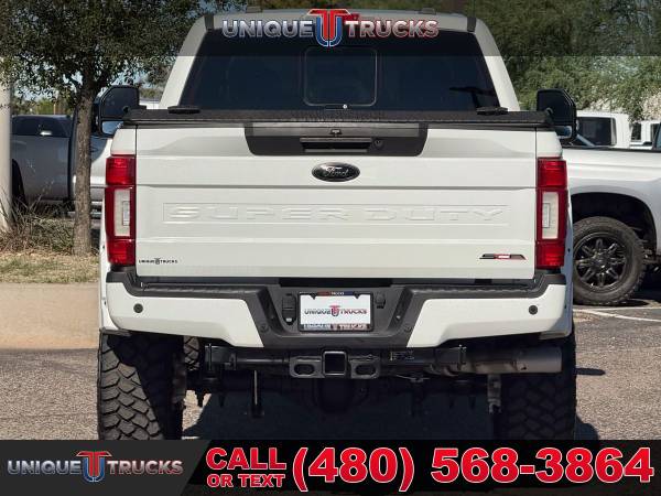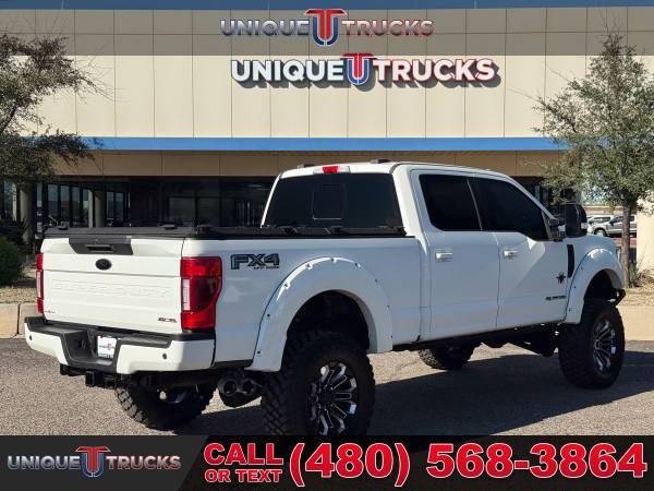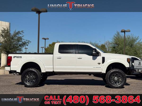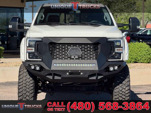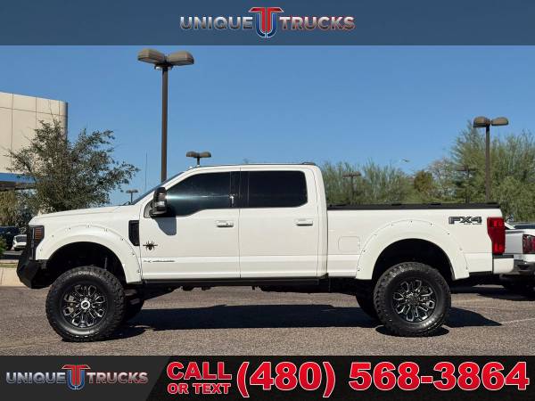 This 2020 Ford F-250 Super Duty Lariat Black Widow Edition is one of the cleanest and nicest lifted trucks you’ll find anywhere. Dressed in the sharp Star White exterior with a sleek black leather interior, this truck grabs attention everywhere it goes. It’s powered by the 6.7L Power Stroke turbocharged V8 diesel engine paired with a smooth 10-speed transmission, giving it the strength, speed, and dependability that Ford trucks are known for. From every angle, this Black Widow edition stands out as a true head-turner that’s hard to find this clean and this well cared for.The Black Widow package gives this truck a bold and custom look. It features a 4-inch lift with FOX shocks for improved ride quality and capability, along with custom 20-inch wheels wrapped in 37-inch tires that complete its lifted stance. The custom grille, fender flares, and projector puddle lights add detail and character to the outside, while the power running boards make it easy to step in and out. Every part of this truck has been carefully designed to look great and perform even better.Inside, the attention to detail continues with custom-stitched headrests, painted trim, and branded gauge clusters that show off the Black Widow identity. The premium black leather seats provide both comfort and style, and the red LED interior lighting adds a nice modern touch. You’ll also notice the tinted front windows that not only enhance the appearance but help keep the cabin cool. Every inch of this truck’s interior was made to combine comfort, style, and functionality.This F-250 Lariat comes loaded with features that make every drive enjoyable and convenient. You’ll get the BoxLink™ system, auto high beam and autolamp headlamps, power tailgate lock, and power-sliding rear window with defrost and privacy tint. The PowerScope towing mirrors are power-folding, power-heated, and perfect for hauling or towing. Add in trailer sway control, trailer brake controller, tow hooks, and a spare tire lock, and this truck is ready for work or play at a moment’s notice.Step inside and you’ll find 10-way power driver and passenger seats, dual-zone electronic auto climate control, and an 8-inch productivity screen. The interior is built around comfort and ease, with one-touch power windows, power locks, and a tilt/telescoping steering column. The 60/40 split rear bench offers flip-up and flip-down seating with under-seat storage for added convenience. From the leather-wrapped steering wheel with audio controls to the 110V/400W outlet, this truck has everything you could need on the road.For entertainment and technology, this Lariat Black Widow Edition is equipped with the 10-speaker B&O sound system, SYNC®3 with an 8-inch touchscreen, and FordPass Connect 4G Wi-Fi hotspot capability. It also includes navigation, SiriusXM, and an electrochromic mirror. Safety and driver-assist features include BLIS with cross-traffic alert, lane-keeping alert, reverse sensing system, rearview camera, pre-collision assist with automatic braking, and multiple airbags including the Safety Canopy® system.This truck also comes with the Lariat Ultimate Package, adding even more great features like a power twin-panel moonroof, LED box lighting, tailgate step, heated and ventilated front seats, remote start system, and universal garage door opener. It’s also equipped with the FX4 Off-Road Package, complete with skid plates for extra protection, and the high-capacity trailer tow package for heavy-duty towing. The 5th wheel hitch prep package, engine block heater, and 397-amp alternator round out its list of work-ready features.Everything about this lifted truck says it’s ready for anything. Whether you’re towing heavy loads, cruising on the highway, or taking it off-road, this 2020 F-250 Super Duty Black Widow Edition handles it all with confidence. It’s been fully serviced, carefully inspected, and is ready for its next proud owner to take it home and put it to work.At Unique Trucks, the price you see is the price you pay—no hidden markups, no add-ons, and no surprise fees. We believe in clear and honest pricing on all of our trucks, including this beautiful lifted Black Widow F-250. You’ll always know exactly what you’re paying for, and you can shop with confidence knowing that we stand behind our vehicles.We also make buying easy with our No Obligation Delivery service. That means this truck can be delivered right to your doorstep for you to see and test drive from the comfort of your own home. You can make your best deal over the phone, and if you don’t love it, you don’t have to buy it. We love trade-ins and welcome you to bring yours in, and we encourage you to come check out our wide selection of lifted trucks in person. At Unique Trucks, we make it simple to find the perfect truck for your lifestyle.