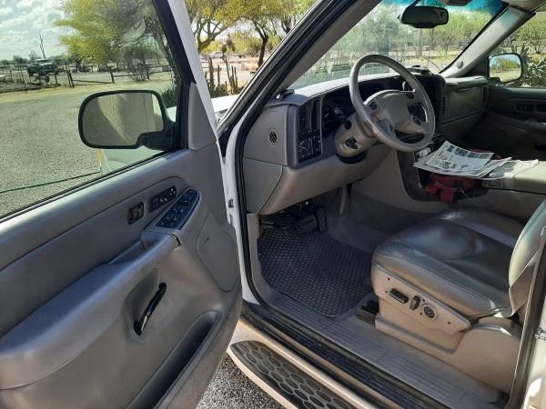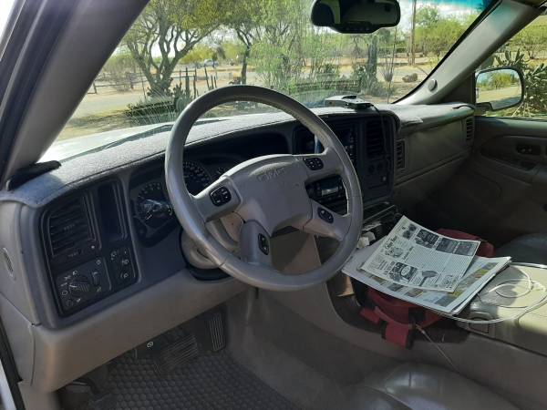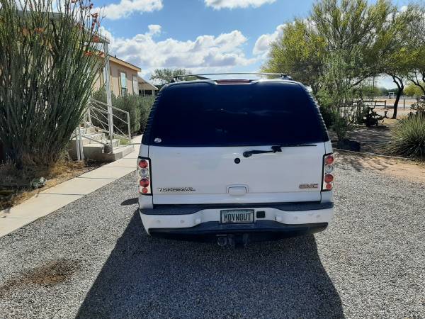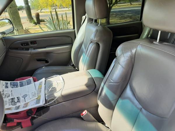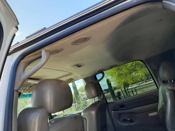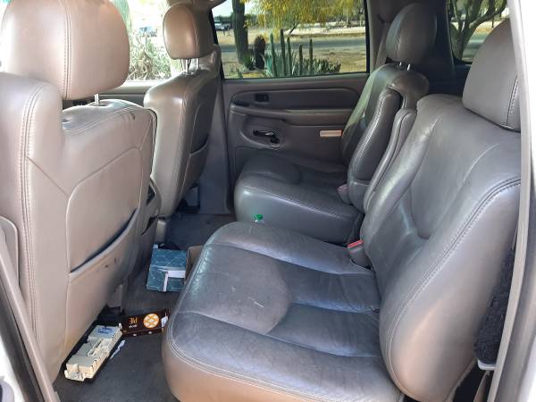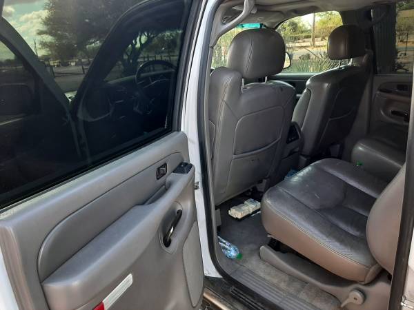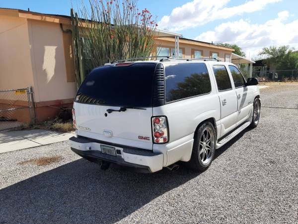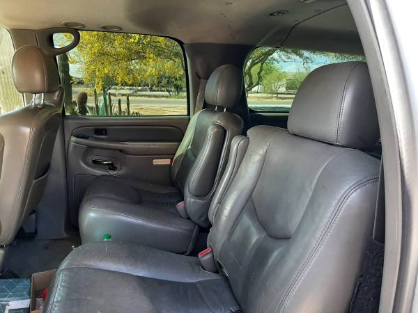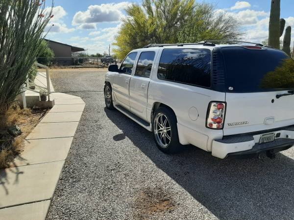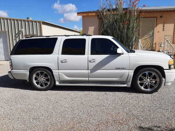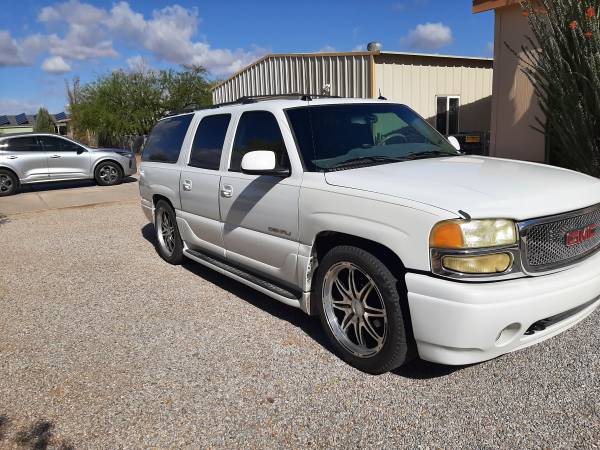 As pictured my 2004 Yukon Denali XL AWD. One owner for the past 7 years. V-8 6.0L motor that runs like a top with 164K miles. White with black trim, tinted windows, gray leather interior. Automatic overdrive transmission, level ride, programable seats/ climate control/ pedals, side mirrors. Heated seats and factory tow package. 6 CD stereo changer with factory Bose speakers. Since I have owned it, the entire front-end suspension has been rebuilt ($1100), entire A/C system overhaul ($1200 5 years ago), it has rear air, vehicle lowered front and rear 4", upgraded aftermarket headlights and taillights, paint matching bug guard. 22" Forte aftermarket wheels near new Perrelli tires. Installed backup sensor system. 16/17 MPG on regular pump gas. In the past 5 years this car has been in 2 fender benders. Minor cosmetic damage in both cases however, only due to its age Progressive gave me no choice but to scrap it 2 years ago. I bought it back and had it professionally repaired and back on the road in 2 weeks for $1500. After repairs were done it went through a required MVD vehicle inspection, passed, and came out with a rebuilt title, see damage photos, cosmetic repairs and a radiator. Vehicle is very sound and quiet, drives very well and is extremely reliable. Another new A/C system $1,000 on 8/20/25, and replace Evac charcoal system $620 10/14/2025, new wipers, and regular Synthetic oil changes. Rebuilt title and cash only. $6,500