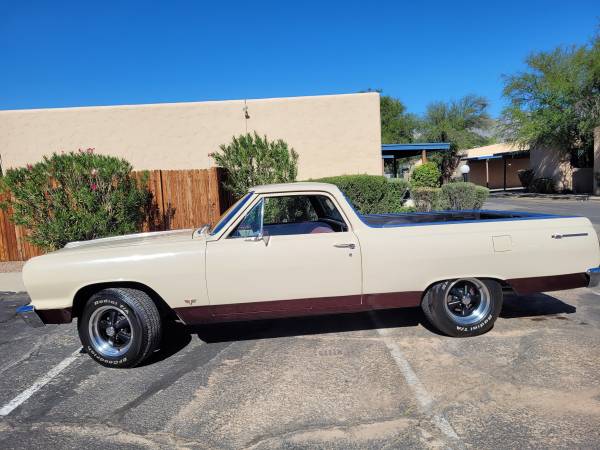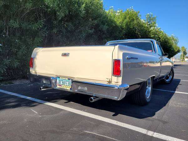 Selling my el camino that I have had for 15 years. These are some improvements I have made. Rebuild 350 crate engine in 2016. Rebuild transmission 2016. Still runs great. Lots of Edelbrock stuff. 4 barrel carb, head covers, air filter. Rebuilt gear box. New 2 tone paint 2018. Wheels Cragars, tires bf Goodrich. New front disc brakes 2019. Ponchos redid upholstery 2017. Original bench seat, door panels, head liner. Newer battery, distributor, starter, water pump. New exhaust 2019. Both bumpers. Modern stereo, retro sound. Wifi. Chrome excellent, all original badge. Very cool ride. Doesn't work, clock, gas gauge