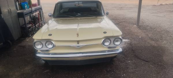 Up for grabs my 1961 Chevrolet corvair running project car it's A automatic two speed powerglide engine was rebuilt not even a year ago it has about now 2,000 miles on the engine it comes with a lot of goodies extra transmission extra wheels and tires and smoothie hubcaps very fun car to drive has a clean title my asking price is $6,500 cash it's worth way more than I'm asking I need the money for bills first come first serve barely push the button she starts right up also had the carburetors rebuilt two days ago just bought brand new tires for it they're coming Monday very cool car first come first serve give me a call show contact info