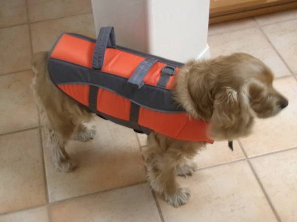 Really cute life vest for dog, like new as my dog won't go near the water. It is a medium, fits 30 to 55 lbs and a girth measurement of 21 to 25 inches according to tag on vest. It measures 14 1/4 inches from back of neck to the tail end of vest. My dog is a Cocker Spaniel and weighs about 33 lbs. Great condition life vest with hook loop closing and clips. Handles on back to pick up dog.