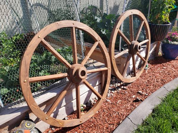 Vintage wagon wheels are hand-made, in Tucson by a Vietnam Vet, out of solid wood with steel rims and brass nails. Wheels are 36-inch diameter: 8 spokes $80 each, 12 Spokes $100 each, 16 spokes $120 each. Other sizes available Spokes are octagon-shaped. Golden oak stain is free and optional.
