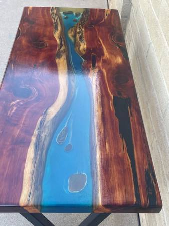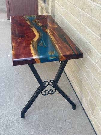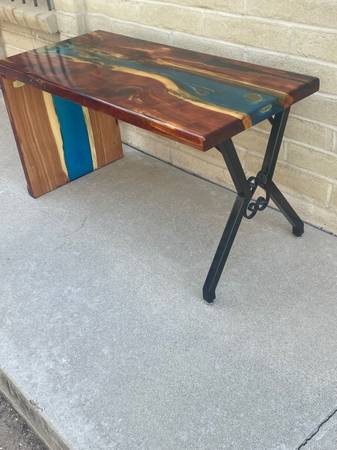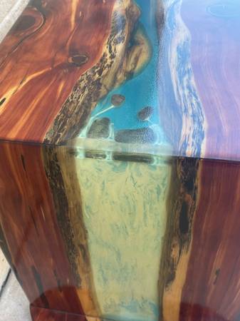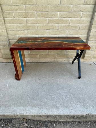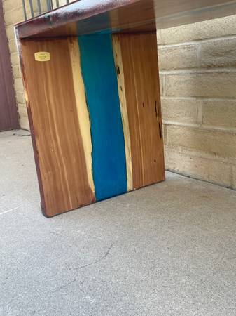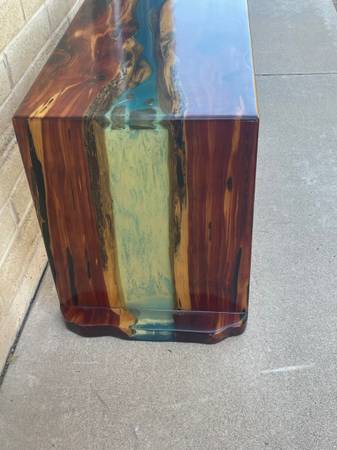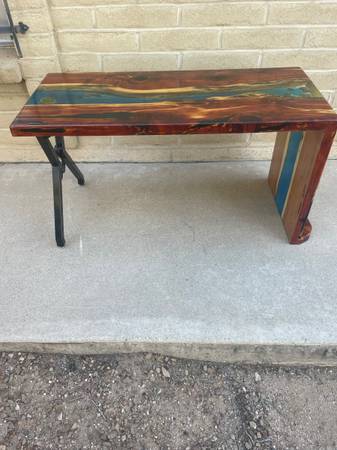 Awesome resin and wood waterfall table. Beautiful colors that just flow through. This is a one of a kind piece. Must see to appreciate. 25 inches tall 45 1/2 inches wide add 3 inches for the bumper...