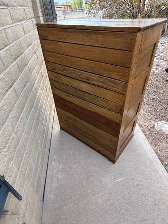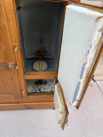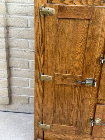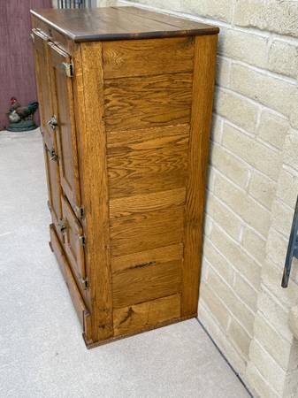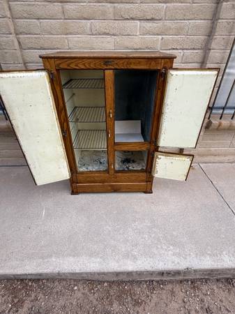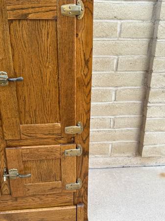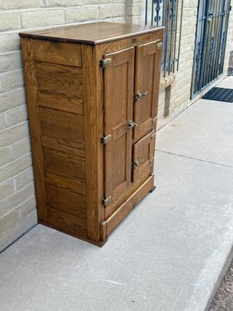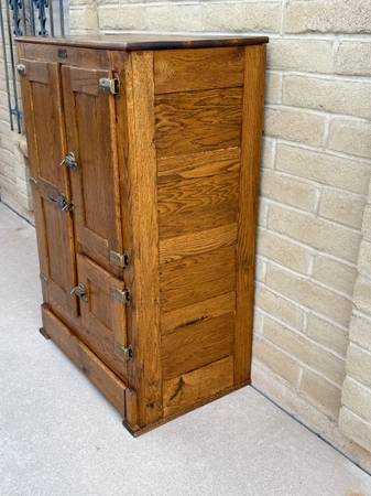 Beautiful antique oak ice box made by Jewel. all original hardware, with three lovely compartments.All doors open and close smoothly. Three original racks on the left side. Must see to appreciate. 49 1/4 inches tall 34 1/2 inches wide 20 inches deep.