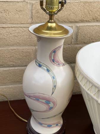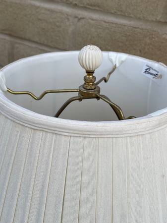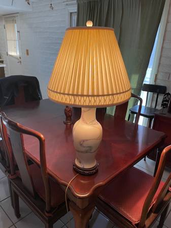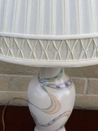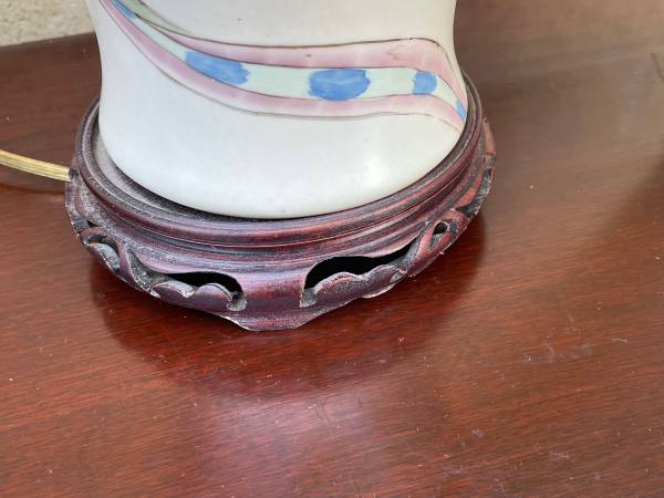 Beautiful ceramic lamp with wood base and lovely Roseart lampshade. 30 inches tall 16 inches in diameter.