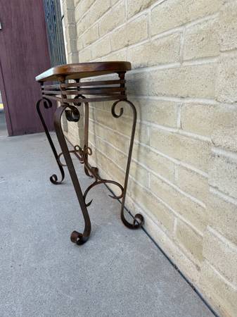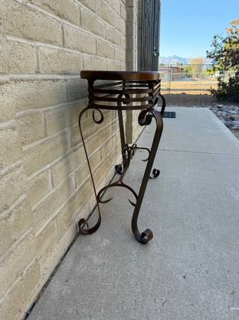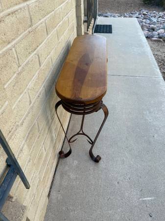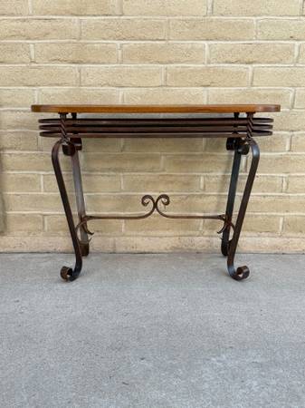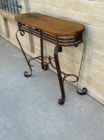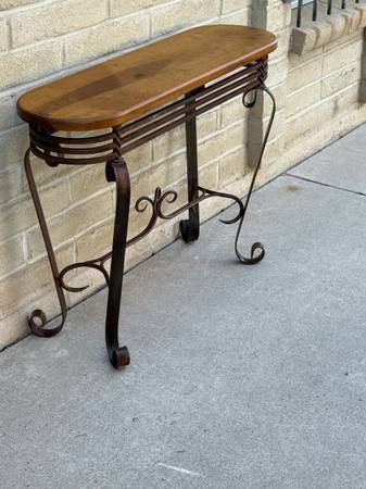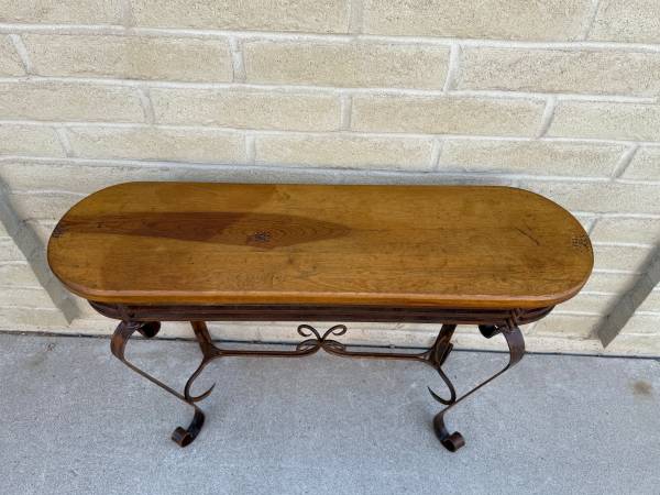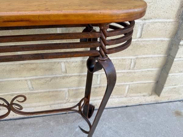 Beautiful wrought iron and wood sofa table. Awesome twisted metal base with amazing craftsmanship. With heavy gauge metal. Lovely wood top with great wood grain. Must see to appreciate. 30 inches tall 42 inches wide 14 inches deep from the curve metal ,12 inches deep for the wood top.