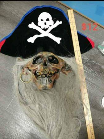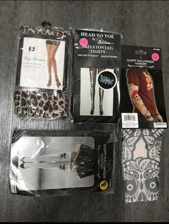 See all pictures for prices. Eerie, haunted. Fantasy. Vibrating/Screaming Hostage Box $5. Jester Joker Hat $5. Belly Dancer Wrap $6. Flesh Leggings(small)$6. Stockings $3each. Two Tattoo Sleeve $3each. Michael Jackson Glove $5 and $6. Large ears 5"× 3.5"$6. Pirate Skeleton Mask $12. Twist the Clown Headpiece. Kontiki Mask $35. $10. Austin power set with wig $8. Tinsel wig $9. Steampunk goggles(missing screw on nose strap $10. Skeleton knit small leggings $6. Talking and light up skeleton $10.Witches hat $12.