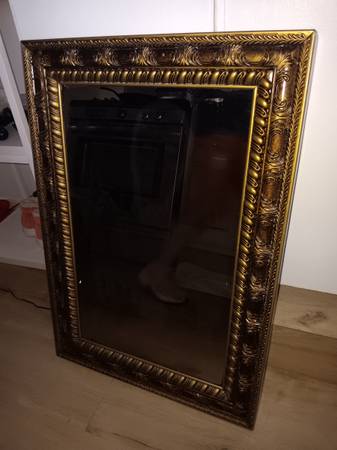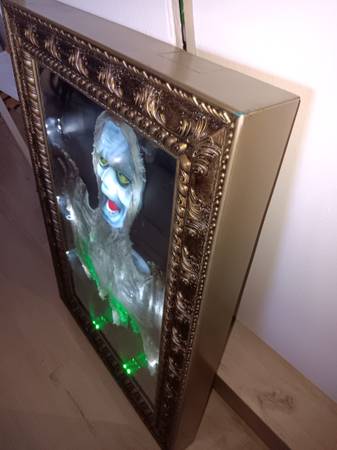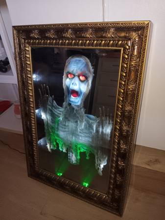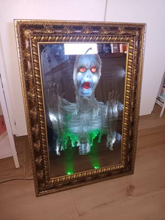 Plastic halloween gold color mirror, ghost lights up and talks. Plug in cord, great condition.