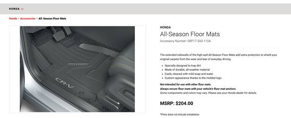 Genuine Honda All-Season Rubber Floor Mats for 2023 CRV Hybrid Sport (no cargo mat) in excellent condition. Vehicle was barely in use and then sold, so no longer needed. Originally bought for $200,...