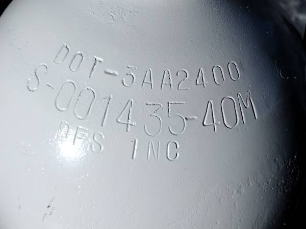 For Sale: Oxygen/O2/N2 High pressure cylinder/tank with valve excellent condition value $750.00 Seamless steel high-pressure cylinder, DOT-3AA2400 lbs Approx. 41" tall × 10.8" dia (~150–200 cu ft...