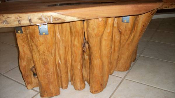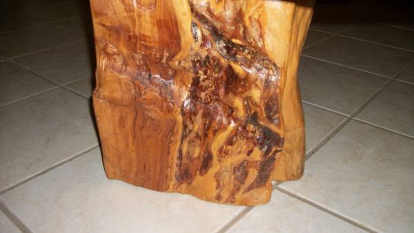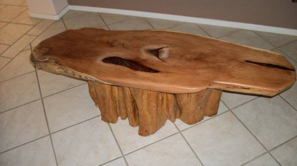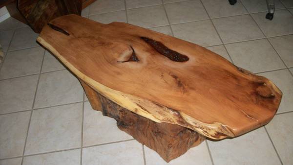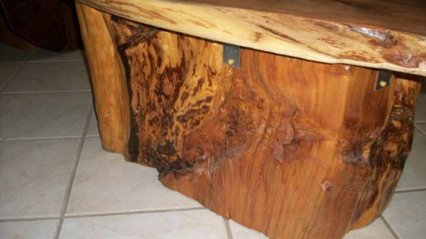 MESQUITE LIVE EDGE COFFEE TABLE MOUNTED ON A BEAUTIFUL STUMP. TURQUOISE INLAY. VERY HEAVY. 52 x 18 x 18 in. $800 CALL 520-743-959 ONE