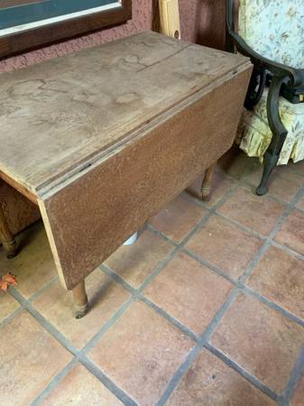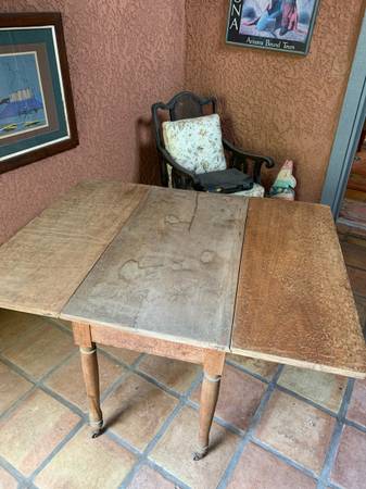 Old farm drop leaf table in very good solid condition. This measures opened up 49 1/4 inches long by 39 inches wide bye 29 inches tall. The table measures closed 19 and three-quarter inches long by 39 inches. A very solid table and even has the original metal wheels.