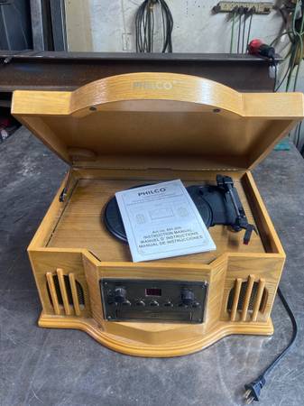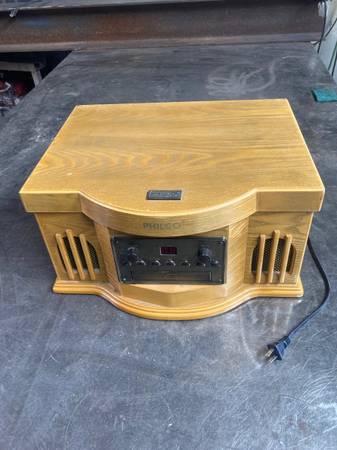 Philco has CD player cassette player and turntable that will handle 33 or 45 records. Turntable turns CD player opens and player is on the right side of the unit antique looking unit