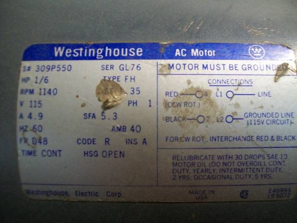 Westinghouse 1/6 HP - 115v - 1140 RPM AC motor. 1/2" shaft. $40.00 OBO. 52zero-731-1870. Calls Only. Will not reply to text message or email.