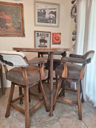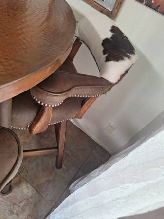 Comes with 3 bar stools. Leather and cowhide. Bar stools swivel.