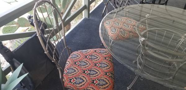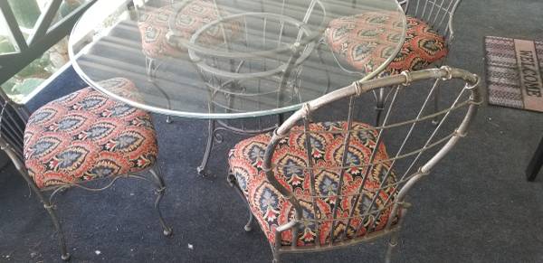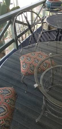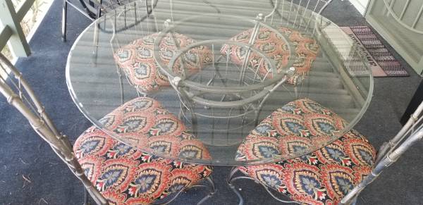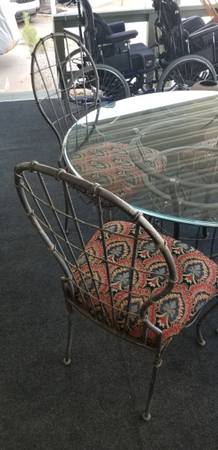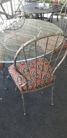 This is a very striking patio set, very heavy duty. Table has a 48" beveled edge glass top sitting atop an attractive stand. Chairs have seen some weathering, not perfect, but well designed and functional.