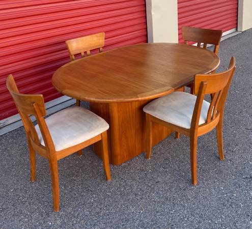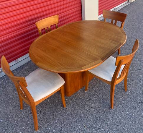 Mid-Century Modern Teak Dining Set Beautiful solid teak dining set featuring a single pedestal base and an oval racetrack-shaped tabletop with a built-in (non-removable) leaf. Table Dimensions: •...