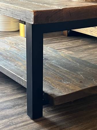 The Pomona 42 in Metal and Wood Coffee Table features the exquisite workmanship of a solid wood top with metal legs that will last for years to come. Each piece is constructed of solid pine wood and finished to have the appearance of reclaimed wood. The reclaimed wood finish highlights natural wood variations such as cracks and knots which add to the piece's character. The Pomona Coffee Table provides plenty of space for your decorating needs. Its solid pine wood tops look like reclaimed wood. Strong, powder-coated steel legs make a statement in your living space.