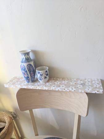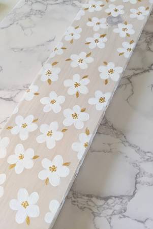 This natural wood shelf features hand painted white floral blooms with metallic gold center and leaves (that reflects in the light). The wood has been white washed and added protective clear seal.