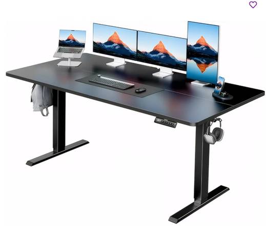 Hi, I have a computer desk that can adjust it's height to be a sitting desk or a standing desk or many different heights in between. I haven't had the desk more than 3 months so it's it good condition. There is a hook on one side that can be good to hang things and there are 4 presets for varying heights. There is a small point of damage, but it was caused during delivery to me when I first ordered the desk. I use it regularly with multiple 27" monitors and other items as well and it remains completely stable.