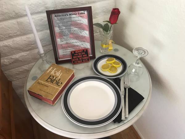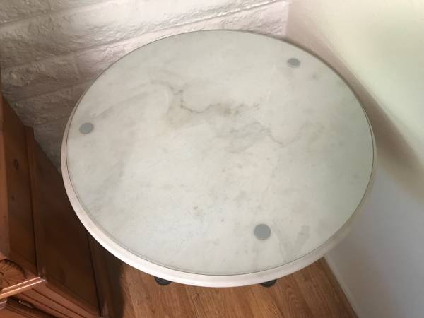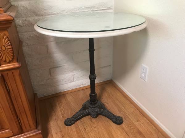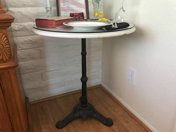 America’s White Table. 29” Tall X 26” Wide. Marble top, glass, wrought iron stand, very heavy. Includes settings, plaque. $150.