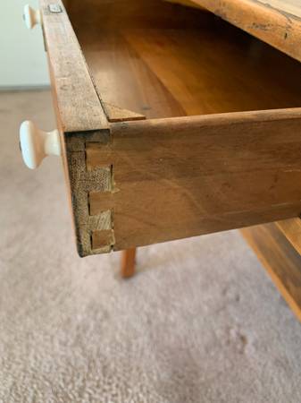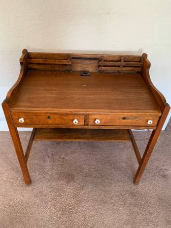 Antique writing desk with a built-in organizer, ink well, often referred to as a secretary desk or a ladies' writing desk. The desk features a flat writing surface and an open hutch or organizer on top with dividers.