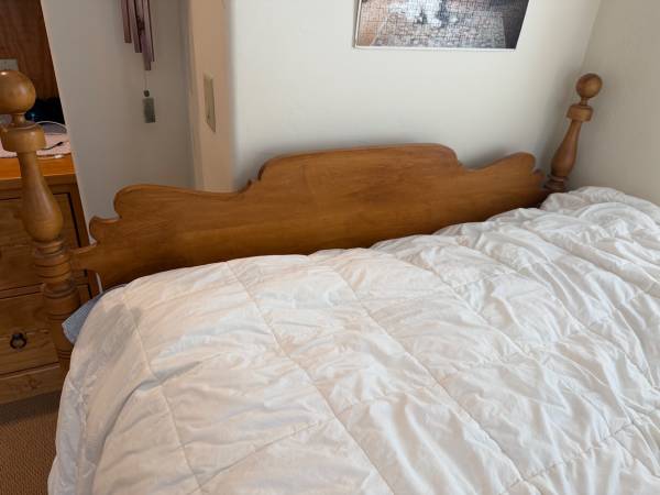 Antique Maple Four-Poster Bed. Excellent condition. Stands 58" high at the head and 48" high at the foot. The bed is 56" wide and 86" long. Because of the condition and artistry of the unique posts, it was recently appraised between $1200-1600. Moving. Will take best offer.