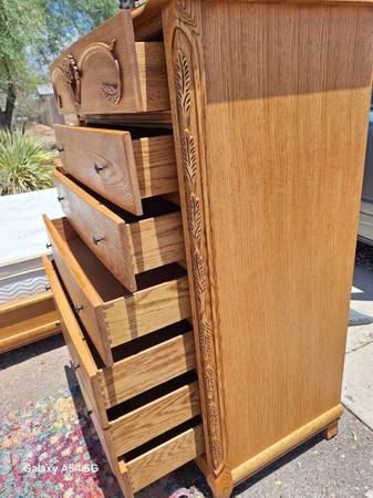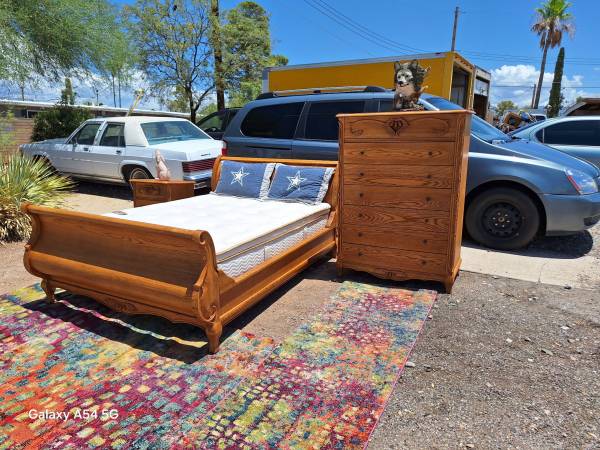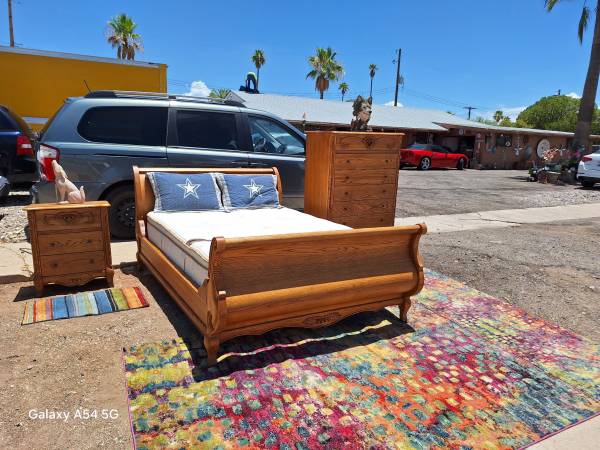 Super solid and Sweet Acorn oak Queen sized sleigh bed with dynasty tongue and groove, cedar lined dresser and night stand. Dresser 40 x24x57 high original price 2000.00 Priced to move at 850.00...