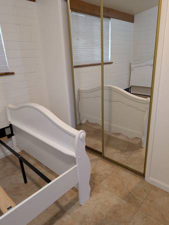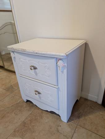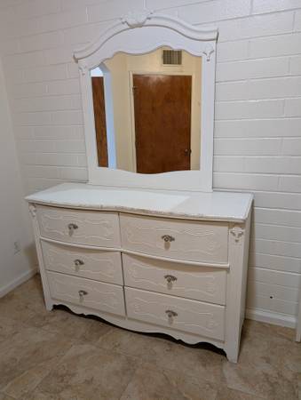 This bedroom set is strong and sturdy. Full size with metal cross members and extra wood rails. *Bed *Dresser/mirror *Night stand