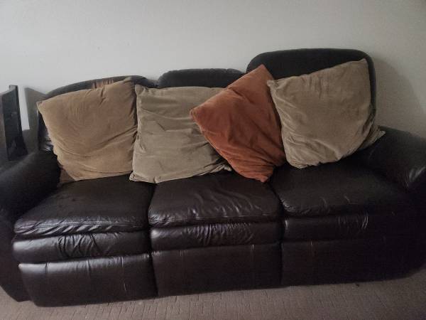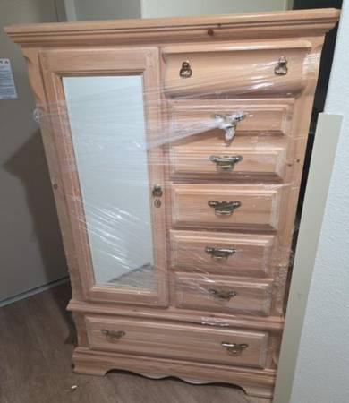 $200 take it all! Living Room SET , 1 tv stand, 1 dark leather recliner couch with a suede reclining chair, bar height KITCHEN TABLE W/4 leather/wood Chairs, 2 brand new Queen mattresses with W/Box Springs And Frames , 1 light Armoire and matching night stand, 1 5 drawer dresser, 1 Chest And a 9 drawer Jewelry drawers.. pick up only sell as set or separately just msg me 🙂