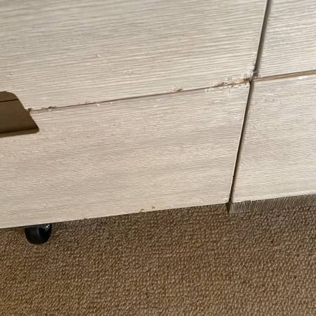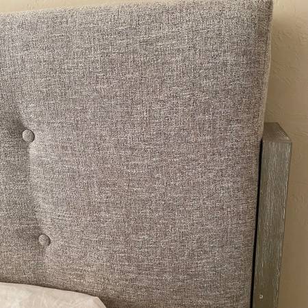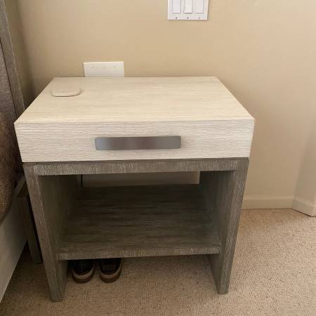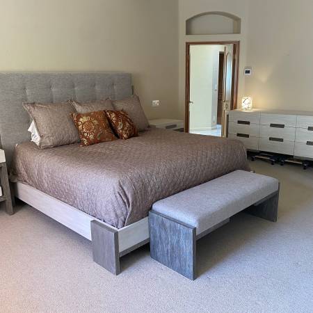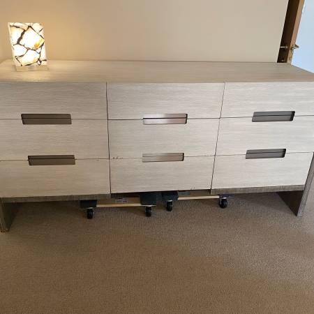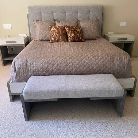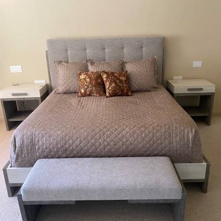 Beautiful Bernhardt “Foundations” modern bed set. Comes with bed frame upholstered headboard, two nightstands, upholstered bench and large dresser drawers. The set is not even two years old. Still sold at stores for over $10,000 for the set! Please note.. The bedding, mattress and mattress base are not included. The dresser drawers were scuffed up in our move, but are still fully functional. The price reflects the damage. Call Nicole show contact info