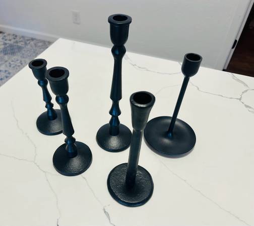Iron type candlesticks that are brand new. 5 total, sizes are 10” to 6” Meet up in NW Tucson, pay by cash. Thank you