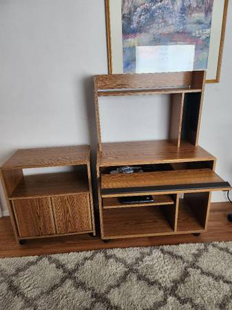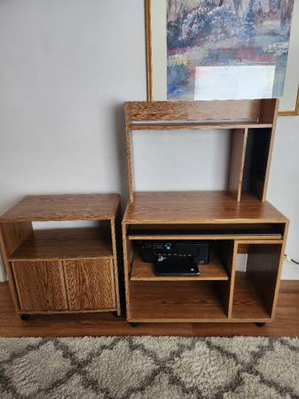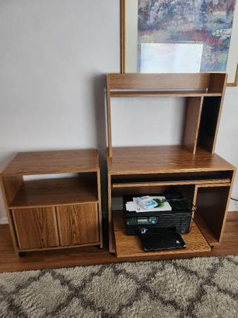 Computer Desk Set with Matching Cart $60.00 Desk has a pullout for keyboard and a separate pullout for a printer, printer not included