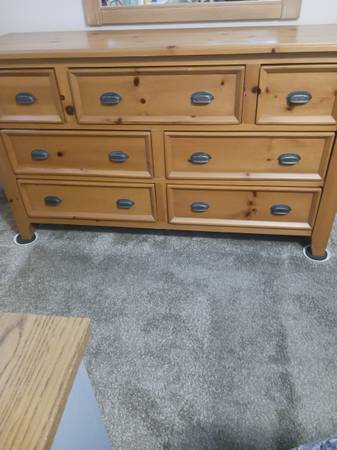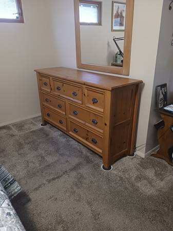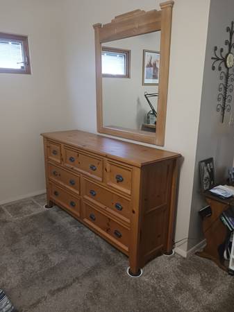 PRICE REDUCED Nice wood dresser and/or mirror (sold together or separately). Dresser dimensions are: 61"L X 35"H x 18"D. Mirror dimensions are: 37.5"W x 43.5"H. Both are in good condition. Asking $150 for the dresser, $30 for the mirror. Make offer for both. No emails please, if interested call/text Linc at show contact info