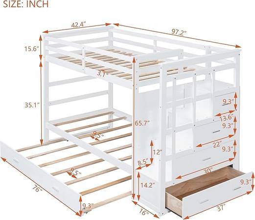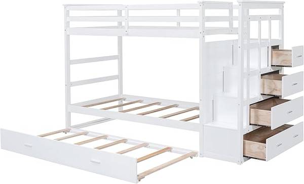 I have a twin over twin bunk bed with storage drawers(on right hand side) and a trundle slide out. The link is to one that is similar to the one I have. https://www.amazon.com/PURLOVE-Storage-Staircase-Stairway-Guardrail/dp/B0CJVFR2PF/ref=sr_1_10?sr=8-10