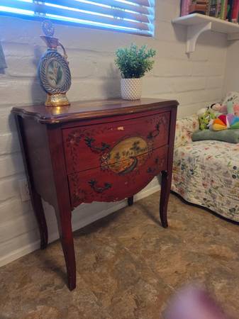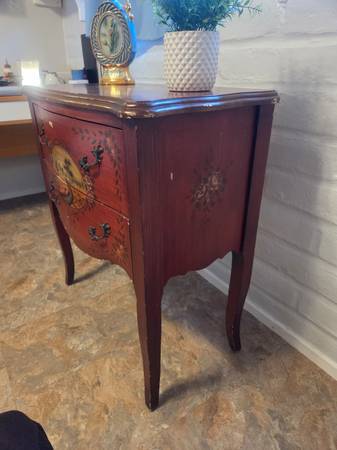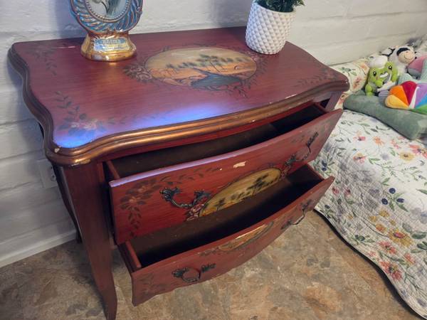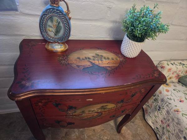 This graceful burgundy chest is offered in a vintage French style with floral details and country scenes plus shapely cabriole legs. It features two drawers. Chest is about 40 years old and does need little paint touch ups. Other than that it is in great condition.