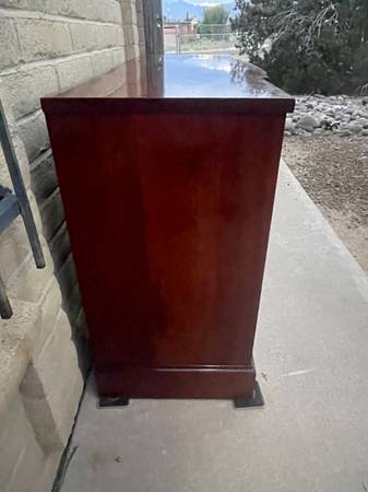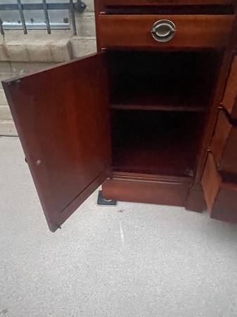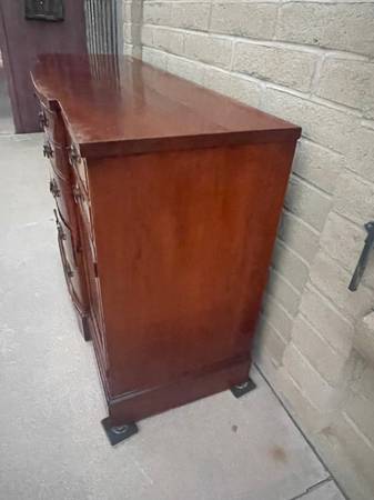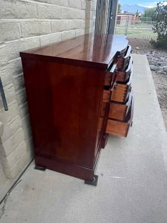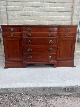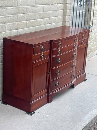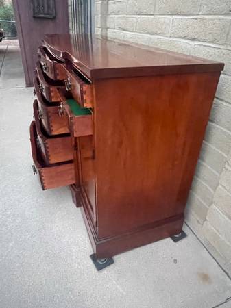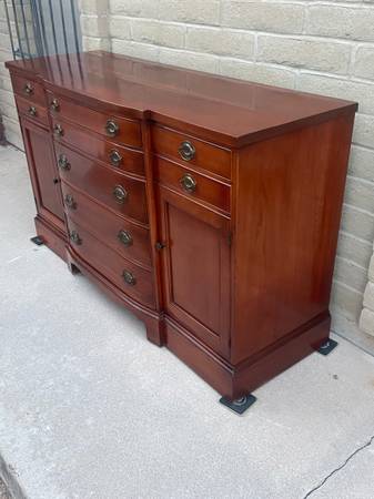 Gorgeous Cherrywood bowfront nine drawer Buffet. Made by. JB Van Sciver Company. awesome craftsmanship and woodgrain throughout with beautiful hardware. Consist of four small drawers at top and five progressively larger drawers with a nice curved edge in the middle two storage areas on either side with shelves. Extra dividers, including 16 slots,seven 11 1/2 inches slats and three 12 1/2 inches slats. So you can create your own design. More photos are available for serious inquiries. This is a very heavy piece bring help to move. 35 1/2 inches tall 60 inches wide 21 inches deep.