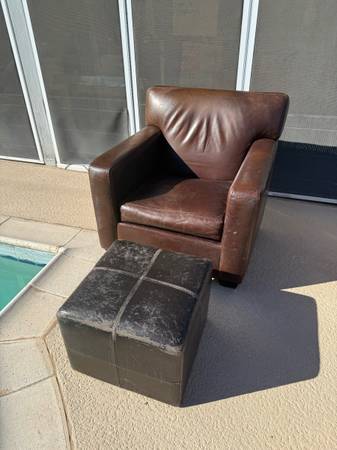 Leather chair and footstool. $67. Comfortable. Not perfect but functional. Seating area is 23 inches wide. Height is 17 inches high. Seat depth is 22 inches. Height is 33 inches. ><>