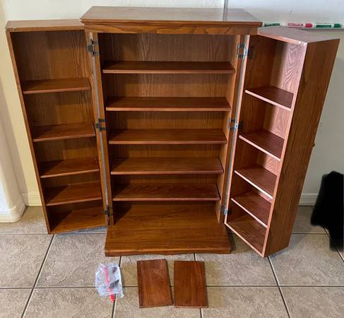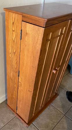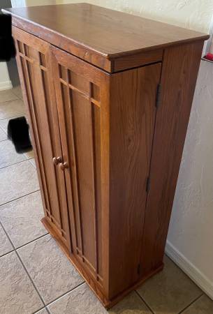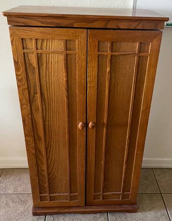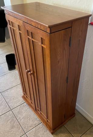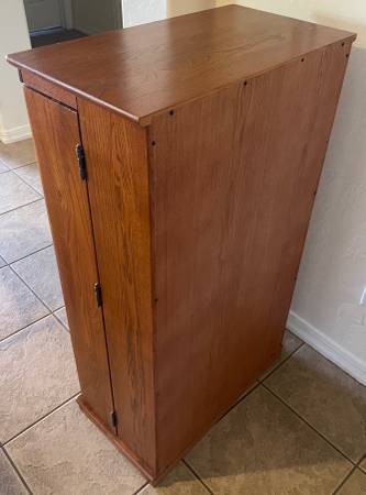 Leslie Dame Solid Oak Multimedia Storage Cabinet in good condition for sale! Store multimedia, cloth23” L x 13” W x 40” H