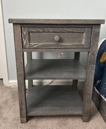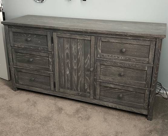 Very good condition 3-piece PB Teen bedroom set - full/double bed (frame only - mattress not included) 1. 6-drawer, 1-cupboard dresser 63" w x 33" h x 19" d 2. Matching nightstand with 2 shelves, 1...