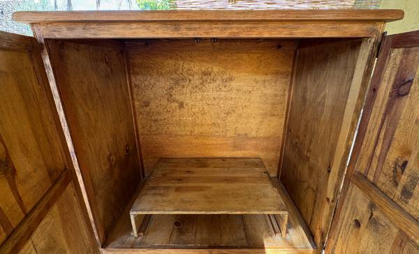 Solid wood. Marked Hecho En Mexico. 47 3/4" wide x 52 1/2" tall x 25 3/4" deep. Holds a 42" flat screen TV. Two drawers, slide-out platform inside. Hole in back for cables.