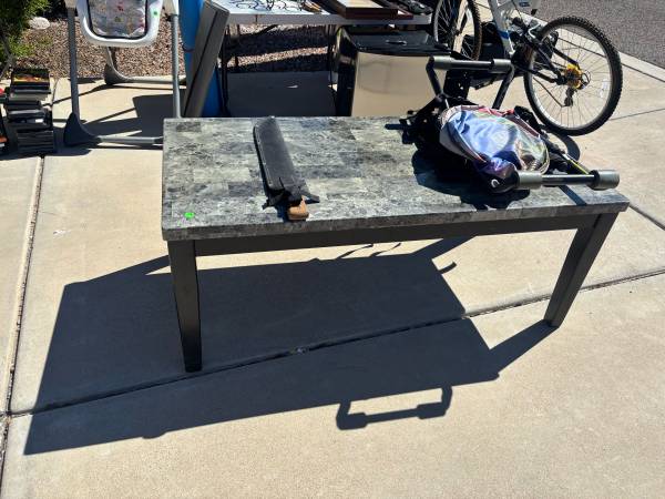 A 2 foot by 4 foot coffee table. It is about 2 feet high. Has a marble faux granite top finish with a black body. In very good condition was only used as a storage spot for a tank.